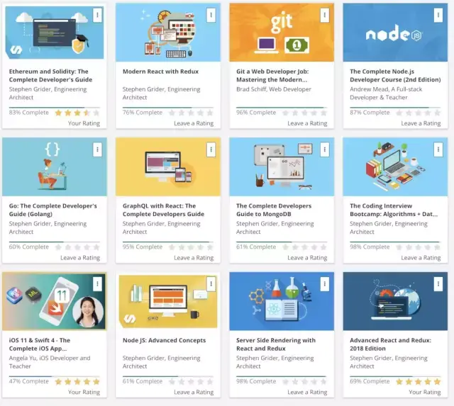Udemy 是个在线教育界的淘宝,什么课程都有。你能在那里学音乐,学绘画,甚至还能学咏春拳…… 当然能学编程,而且有些热门编程老师确实很厉害。Udemy 有个套路,标价 200 美元的课程,经常悄悄打折 9.9 美元卖。我所有课程都是最低价买的,前后一年半共买了 60 多门课,通常是在黑五圣诞等折扣季买,当然,Udemy 几乎每个月都在促销。我买的课程覆盖前端后端,深度学习,区块链开发等。我只把前端课程的 2 / 3 学了,其它的真学不动了,大多数属于冲动消费……