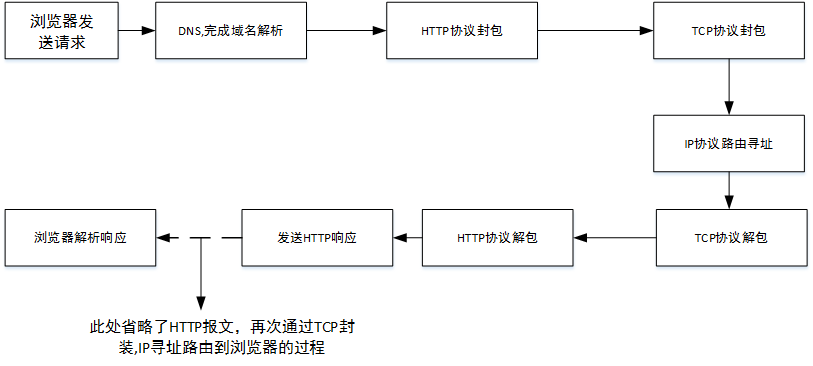 HTTP协议是TCP/IP协议栈的一部分,按照TCP/IP协议分层理念,其位于应用层。一个完整的通信流程必然是由许多协议相互配合完成。本节将介绍HTTP协议是如何配合其他协议完浏览器发出请求到获取响应的通信过程