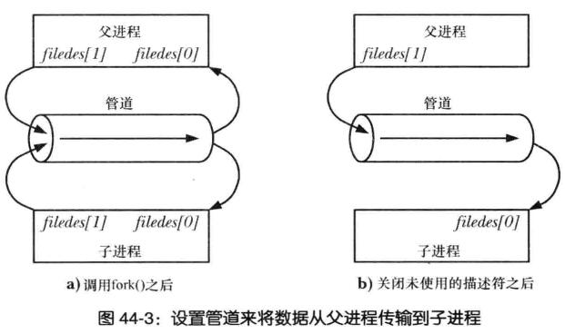 int pipe(int filedes[2]);//return 0 on success,or -1 on error