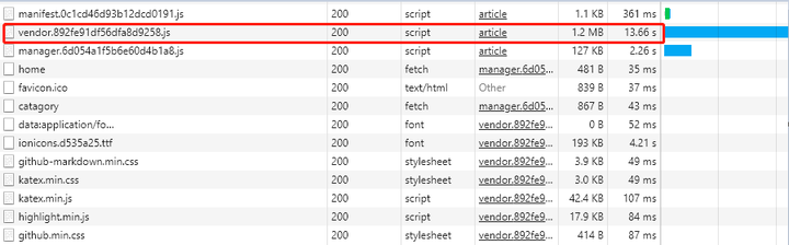 通过下面的打包文件结构图中可以看到,vendor主要包含的依赖有highlight、mavon-editor、vue、vue-moment、marked、vue-router,iview等,而实际中mavon-editor、iview只有在管理端会用到,highlight、marked只会在客户端用到,因此优化的一个要点就是分离第三方依赖。但是分离的时候要考虑到,即便将依赖分离后依赖文件仍然存在服务器上,而相对来说很多成熟类库会提供cdn结点,访问cdn会比访问自己的服务器要快,因此优化的第一步是对相关依赖用cdn方式引入。