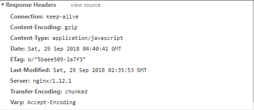 使用nginx会默认开启缓存,对静态文件的响应加上Etag,如下图。这样浏览器二次加载的时候只要服务器的静态文件没有发生变化,就会从缓存中读取,进一步优化了页面响应速度。