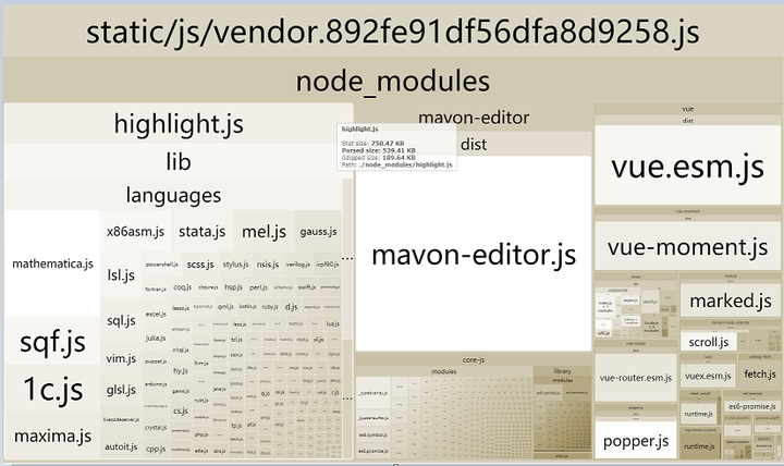 其中,key是node模块名称,value是项目中对模块的引用。然后执行npm run build --report,再观察一下打包后的vendor文件,如下图,可以发现,externals中的依赖都没有被打包进来。由于少了highlight.js,vendor体积一下子缩减了一半多,只有500kb左右。