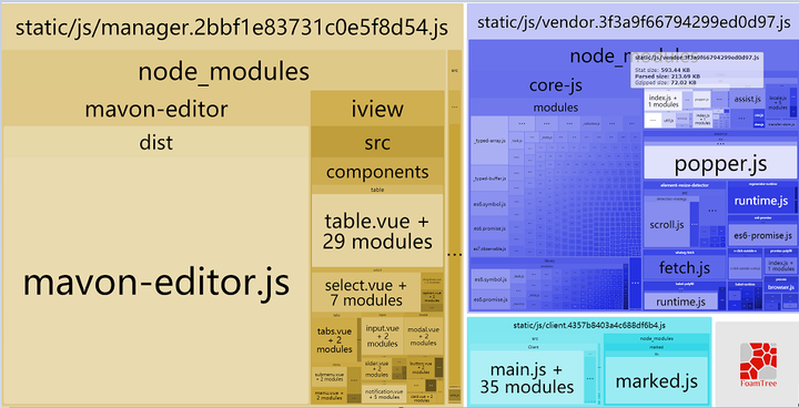 从上图中可以看到,造成加载时间过慢的元凶是vendor文件,该文件存放的是项目中所有的第三方依赖。而且从下图可以看出,这个文件同时被管理端使用,体积有1.2M。
