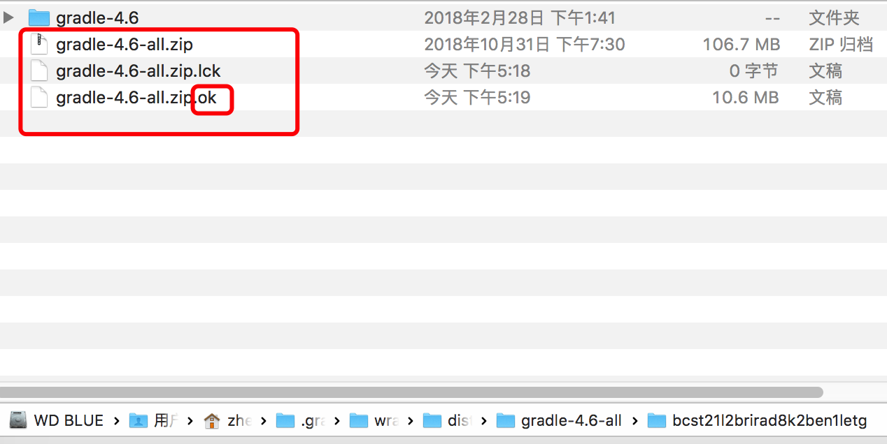 这里要着重说一下的是,当我们从别处下载gradle 的压缩包,直接解压到gradle目录的时候,一定要注意把图中圈出的ok 后缀给改了。那个就是个空文件,但是不改ok的话,Android studio 是不识别我们拷贝进去的gradle 文件夹的。