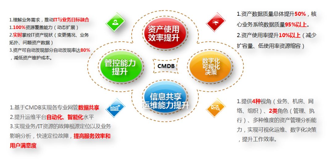 总体来说,实施CMDB我们可以获得下面四方面的收益:资产管控能力提升、资产使用效率提升、数字化可视化决策的能力、信息共享提升运维能力。具体的收益可参考下图: