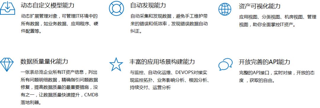 在CMDB具体落地时,我们应该优先关注CMDB的六大核心能力建设,具体包括动态定义模型能力、自动发现能力、资产可视化能力、数据质量量化能力、应用场景构建能力、API接口能力。具体的核心能力如下图: