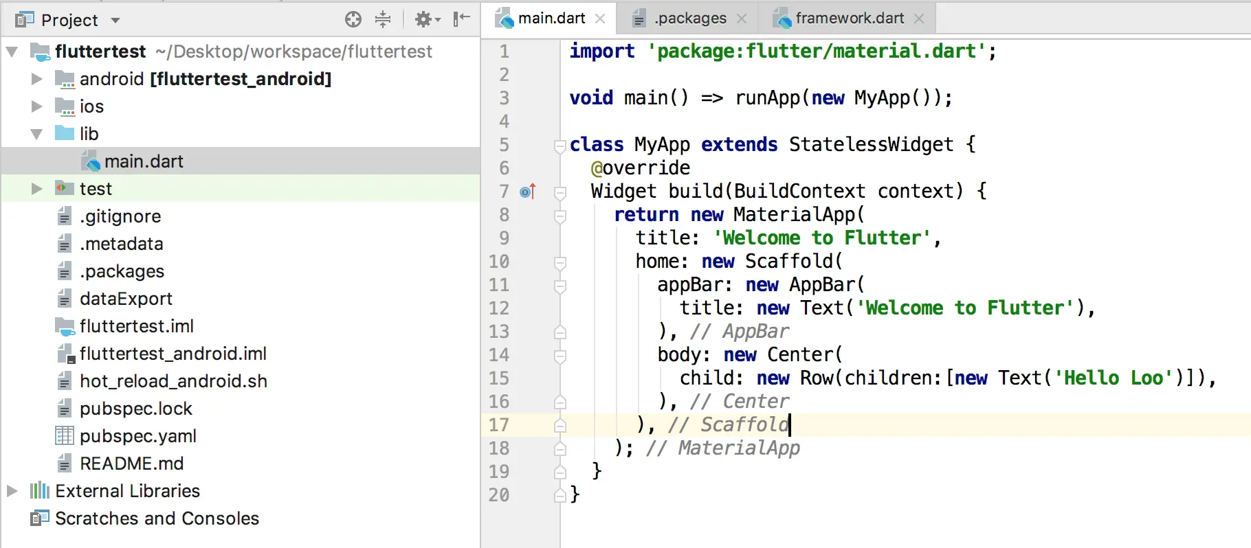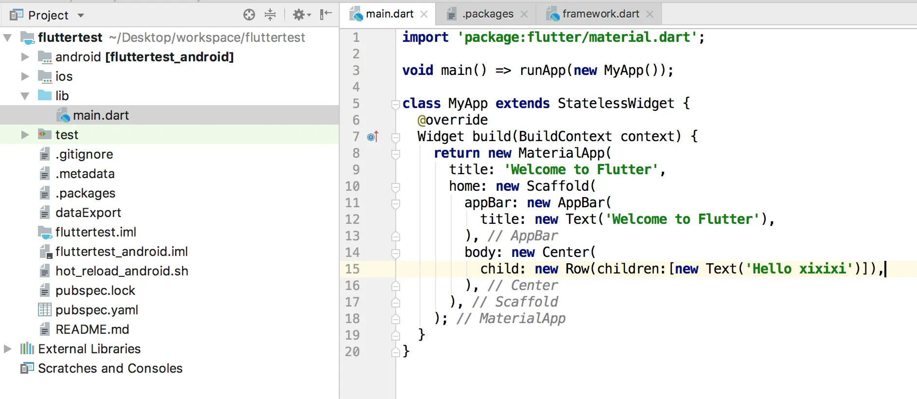 我们创建一个名为fluttertest的简单flutter项目作为例子。