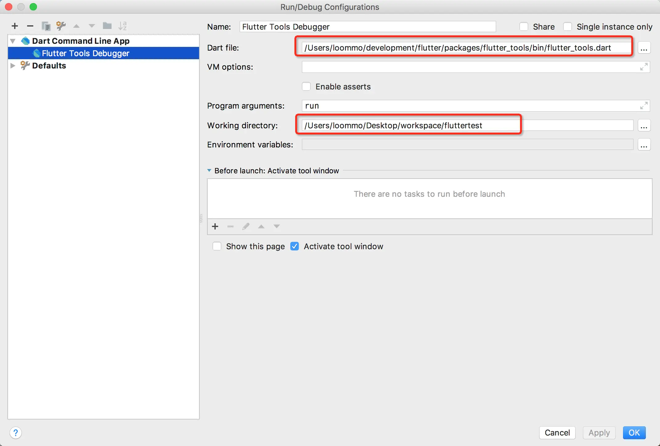 添加新的Debug Configurations,woking directory设置为fluttertest项目地址