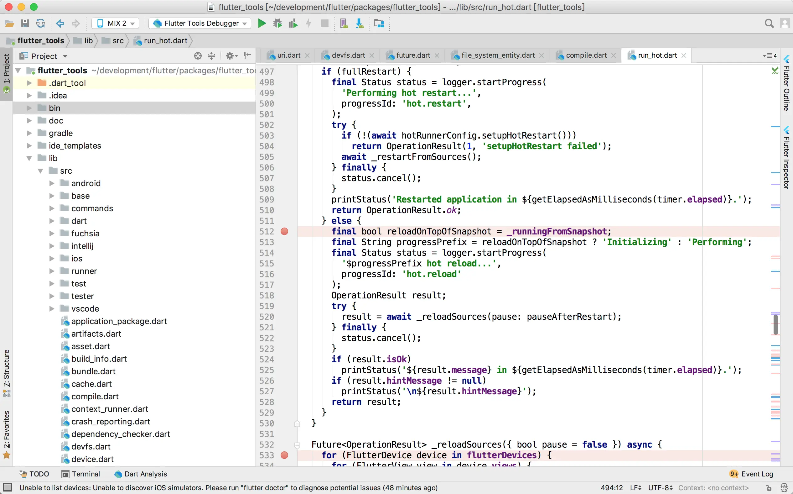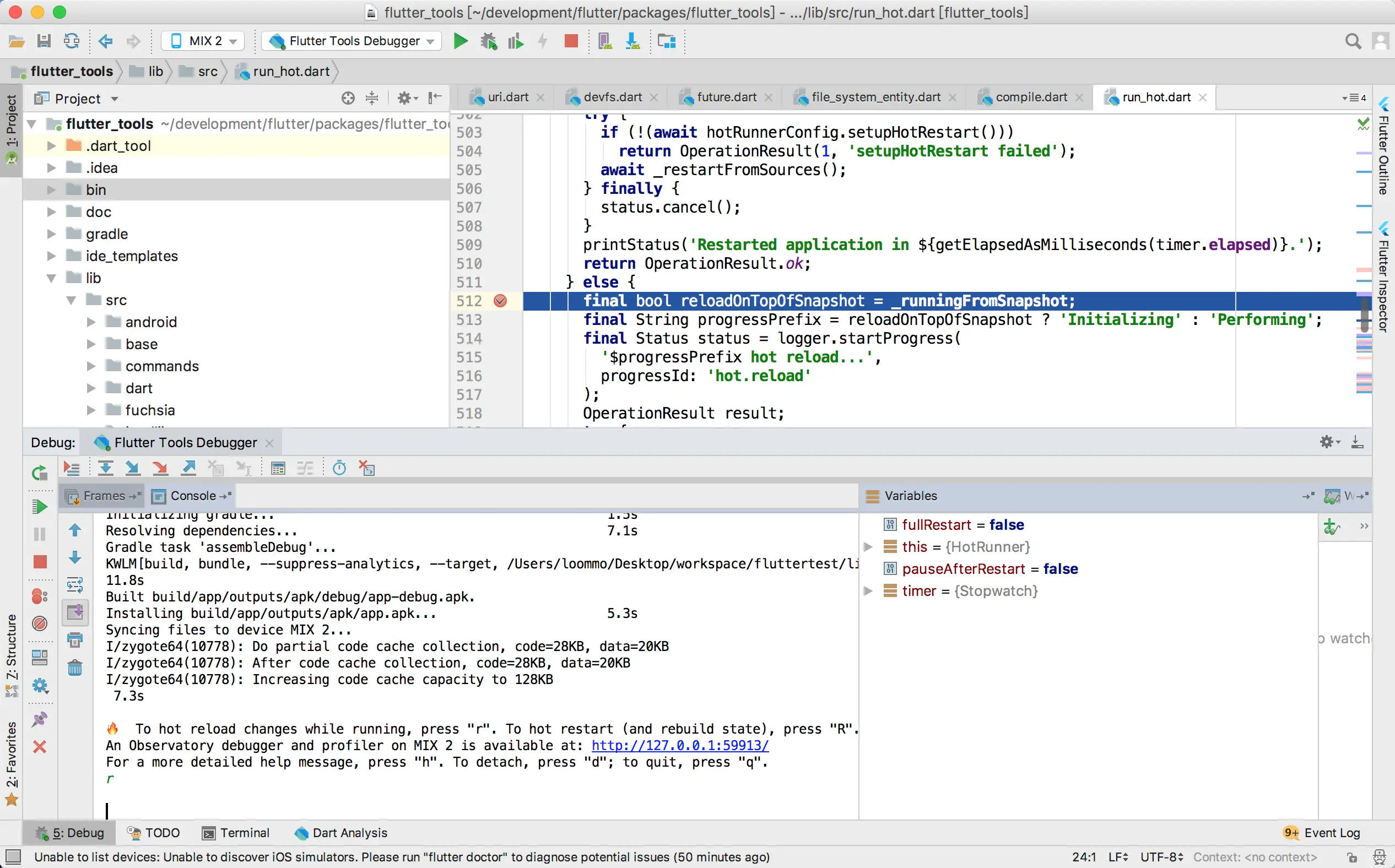 使用AndroidStudio打开flutter_tools(/flutter/packages/flutter_tools),断点设置为HotRunner.restart()方法