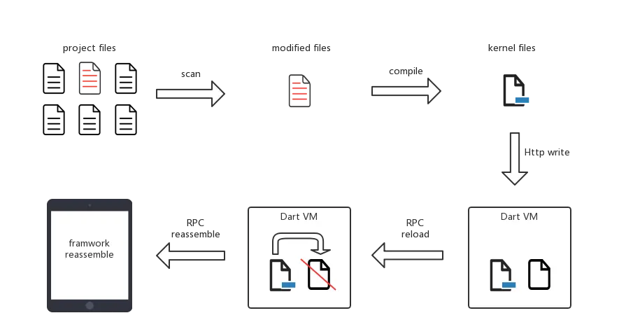 - 首先_updateDevFS()会将工程中文件逐一扫描,检查是否有删除、新增或者改动,扫描完成后,生成kernel files,命名为app.dill.incremental.dill文件,通过HTTP端口发送给DartVM;