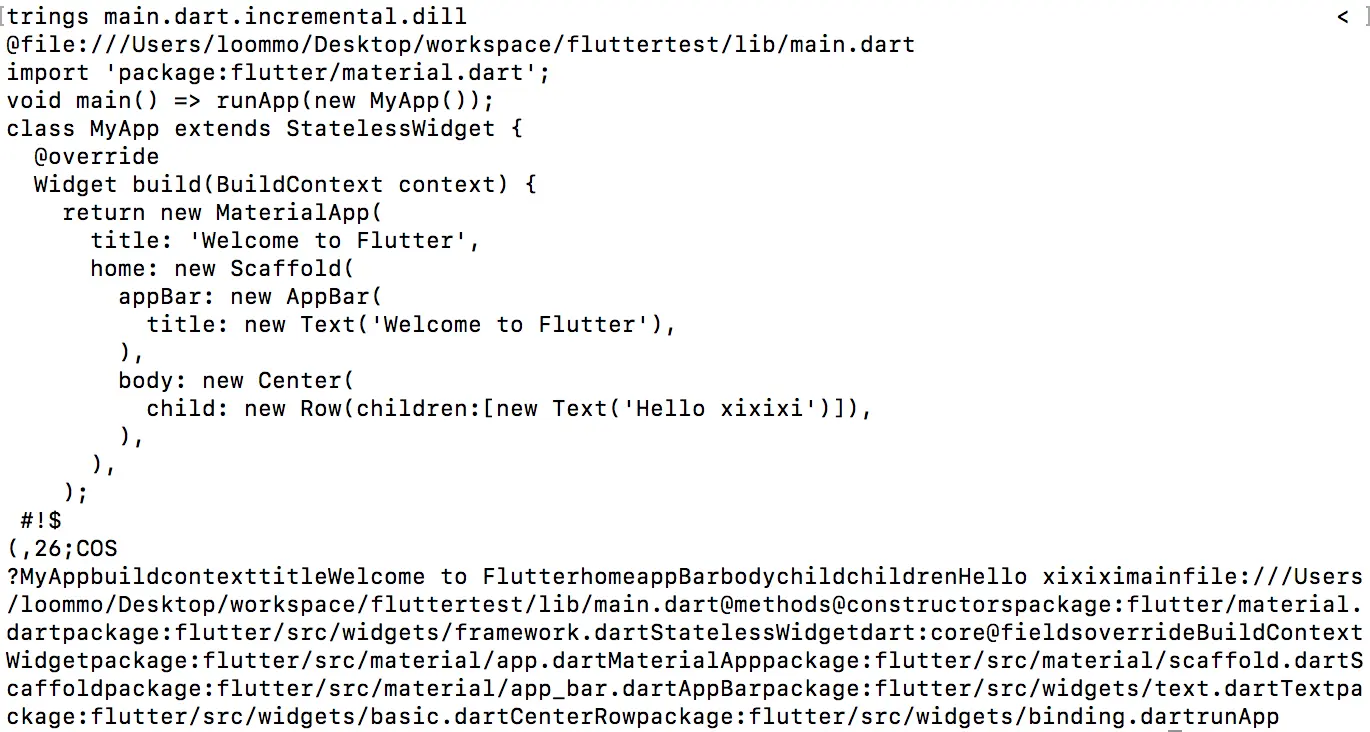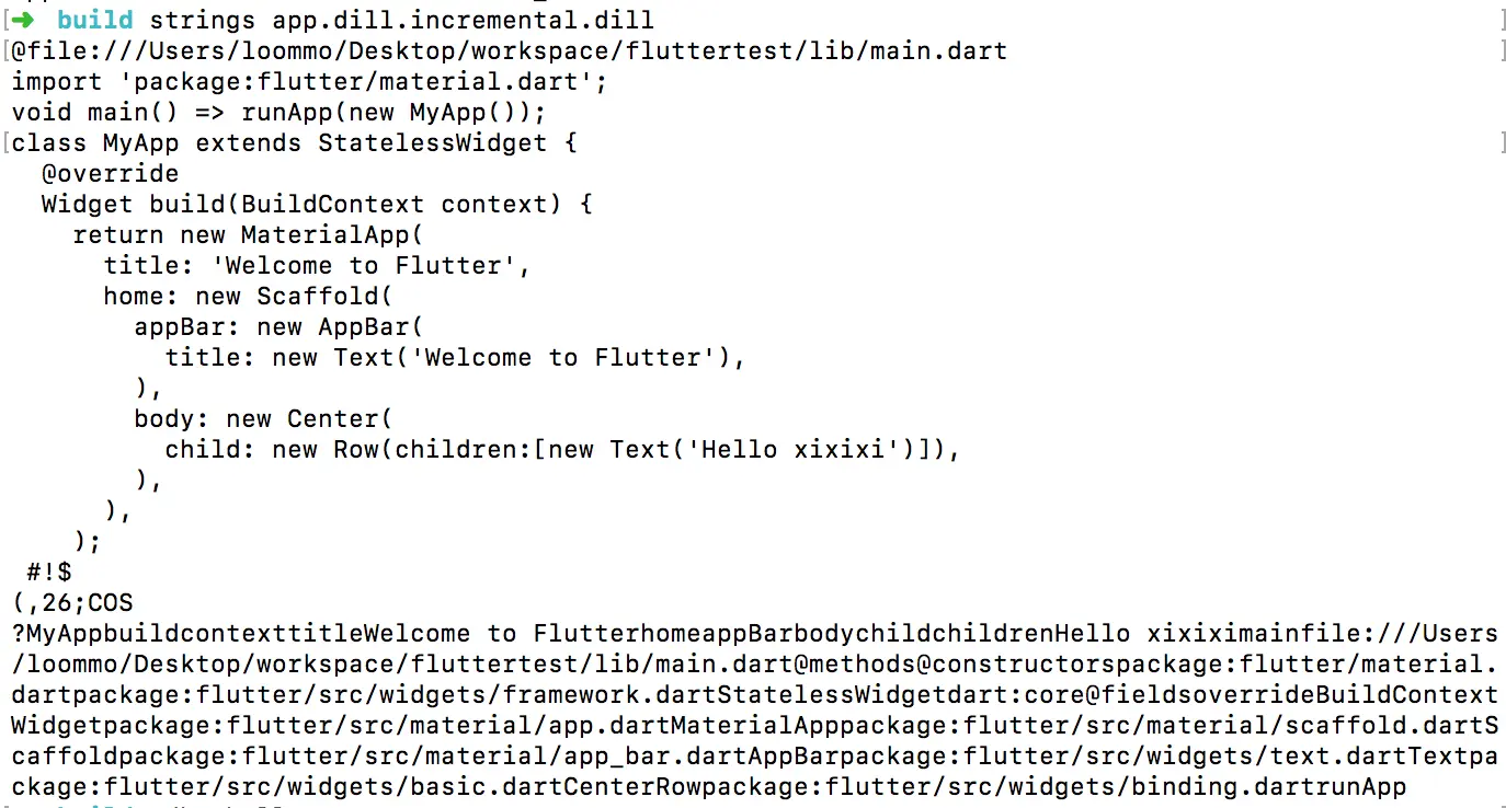 检查项目,可以发现项目目录/fluttertest/build/下新增了app.dill.incremental.dill文件,通过strings命令解析后,发现仅包含我们所改动的dart文件。