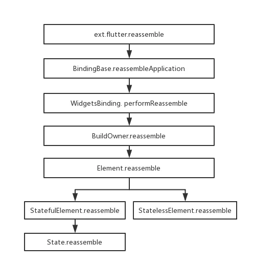 服务触发后,BindingBase.reassembleApplication-> WidgetsBinding. performReassemble -> BuildOwner.reassemble -> Element.reassemble 由根节点开始一步步实现widgets树重建。