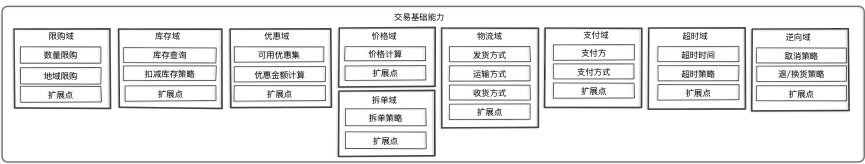 可以确定几乎所有的交易都会涉及下图中所有的领域(库存,优惠,价格…),而单看每个域,玩法都是很少变化的,将这些域的基础能力完全可以沉淀下来形成原子的基础能力,通过扩展点方式应对将来特殊的场景个性化扩展。