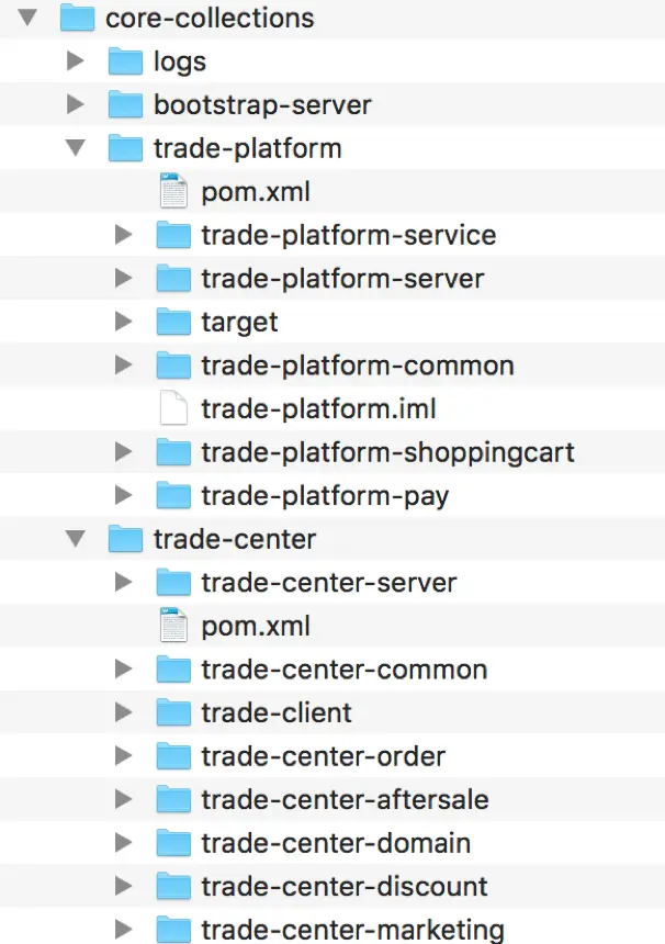 逻辑结构映射到物理的工程结构,每个逻辑单元对应为一个子工程,如果是用idea 开发,就是一个model, 当然model 里边会有子model;至于需要打包构建多少个系统其决定性因素是你团队的规模,如果团队规模较少,中台系统合并到3-4个左右就足够了,如果团非常大,一个团队负责一个业务板块的,并为其构建多个系统,也是非常正常的,像较大的电商公司,负责商品的就是一个团队,商品相关的系统就有数10个。以交易为例,可以将交易的系统合并为一个系统,但在工程的组织结构上是对立的,方便将来的拆分。