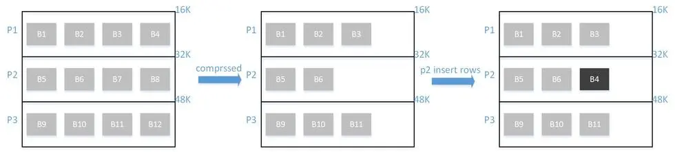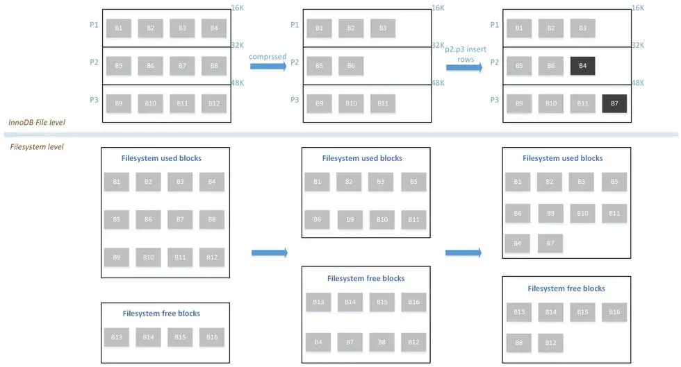 假设有个16KB的InnoDB页P1,通过块压缩为11KB,如果表空间使用的文件系统在mkfs时指定block size为4KB,那么只需要使用3个文件块来保存11KB的数据,节省1个文件块即4KB的空间。那么是不是说InnoDB下个页P2的数据直接从所节省的这4KB开始写入吗,答案是否定的。