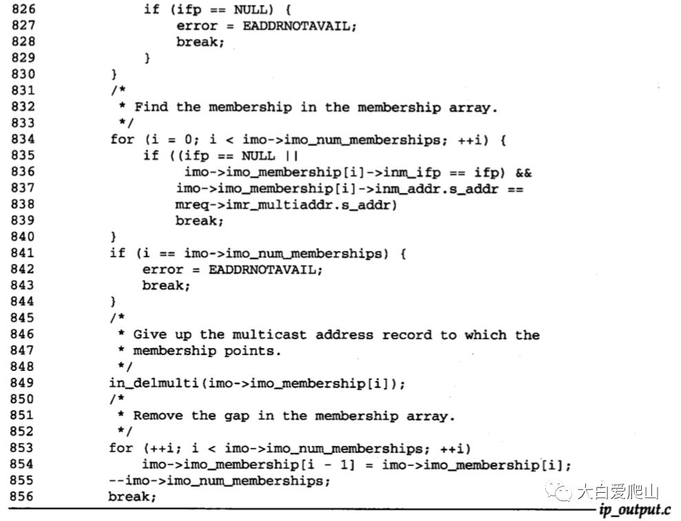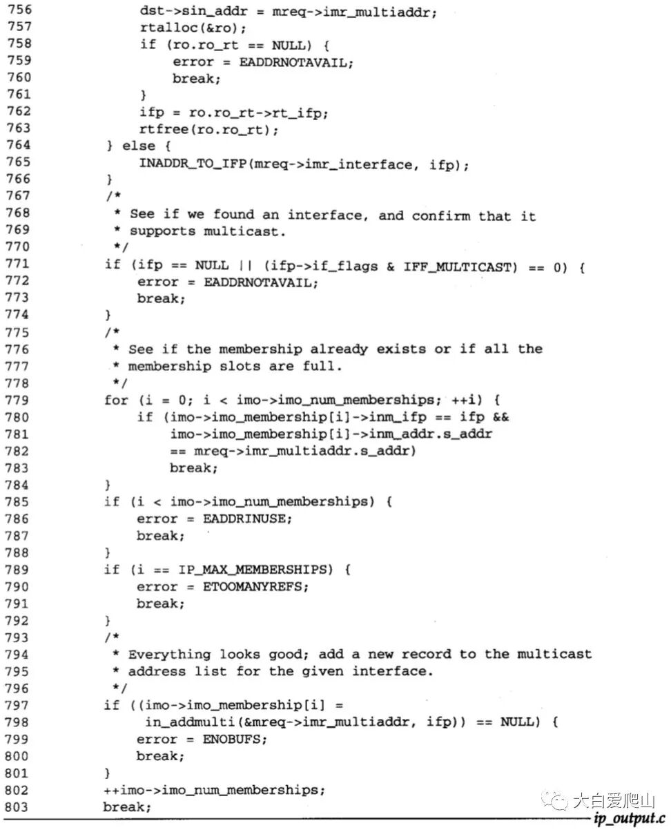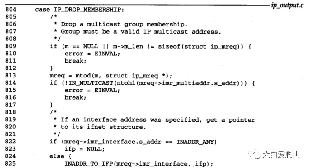 804~830 存储器缓存中必然包含一个ip_mreq结构,其中的imr_multiaddr必须是一个多播组,而且必须有一个接口与单播地址imr_interface相关。如果这些条件都不满足,则将返回EINVAL和EADDRNOTAVAIL错误信息,继续到swithc语句的最后进行处理。