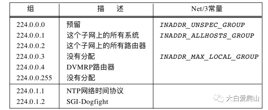 和UDP、TCP端口号一样,互联网号授权机构IANA维护着一个注册的IP多播组表。图1列出了一些知名多播组。