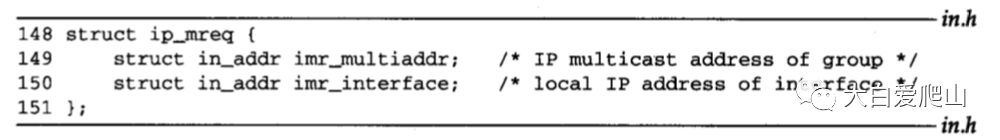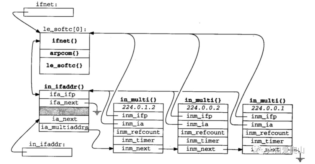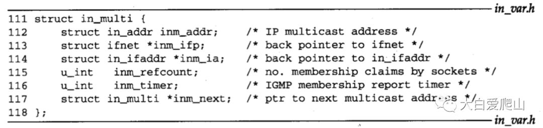 inm_timer是第13章描述的IGMP协议实现的一部分,最后,inm_next指向表中的下一个in_multi结构。
