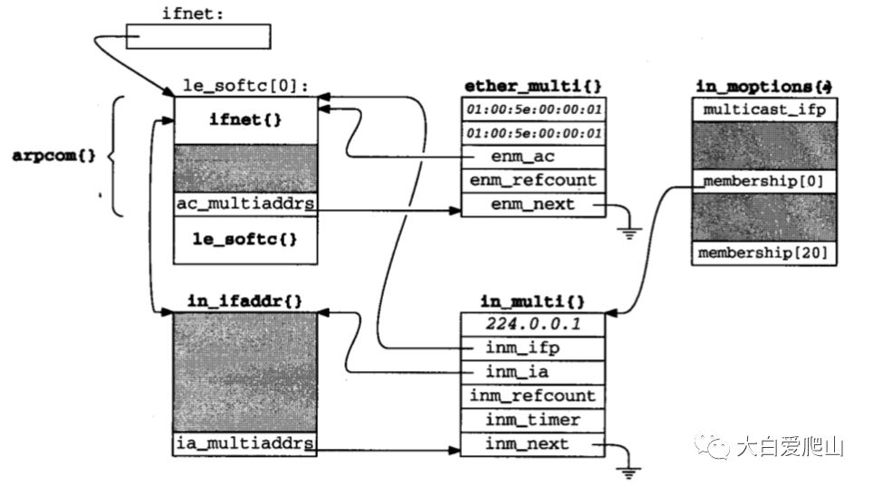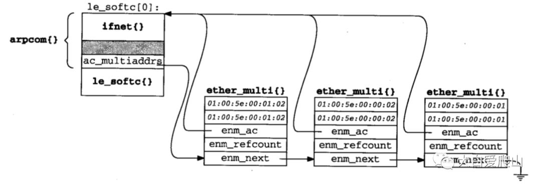 enm_ac指回相关接口的arpcom结构,enm_refcount跟踪对ether_multi结构的使用。enm_next把单个接口的ether_multi结构做成链表。图5显示出,有三个ether_multi结构的链表附在le_softc[0]上,这是我们以太网接口示例的ifnet结构。
