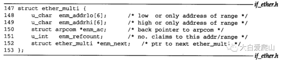 147~153 enm_addrlo和enm_addrhi指定需要被接收的以太网多播地址的范围。当enm_addrlo和enm_addrhi相同时,就指定一个以太网地址。ether_multi的完整列表在每个以太网接口的arpcom结构中。