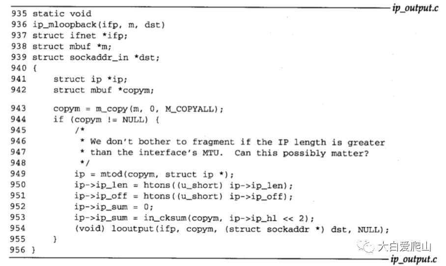 929~956 仅仅复制分组是不够的;必须看起来分组已经被输出接口接收了,所以ip_mloopback把ip_len和ip_off转换成网络字节序列,并计算分组的检验和。looutput把分组放到IP输入队列。