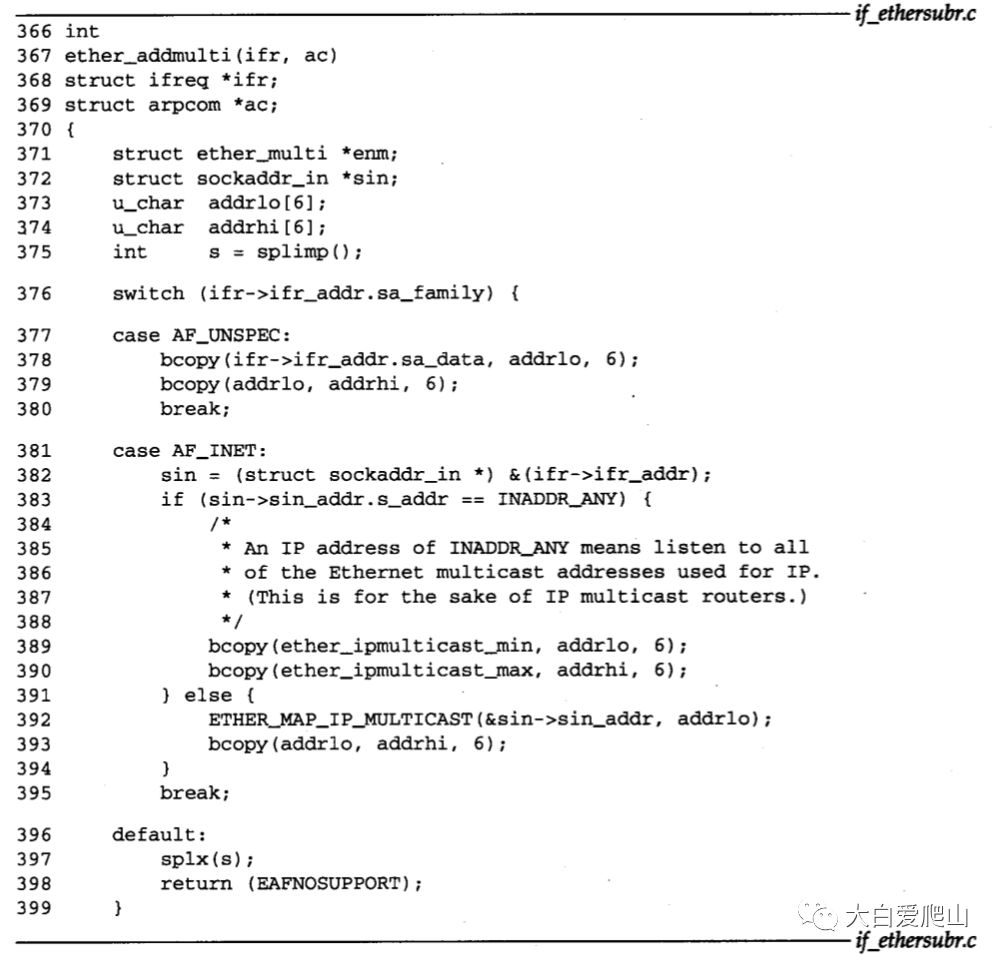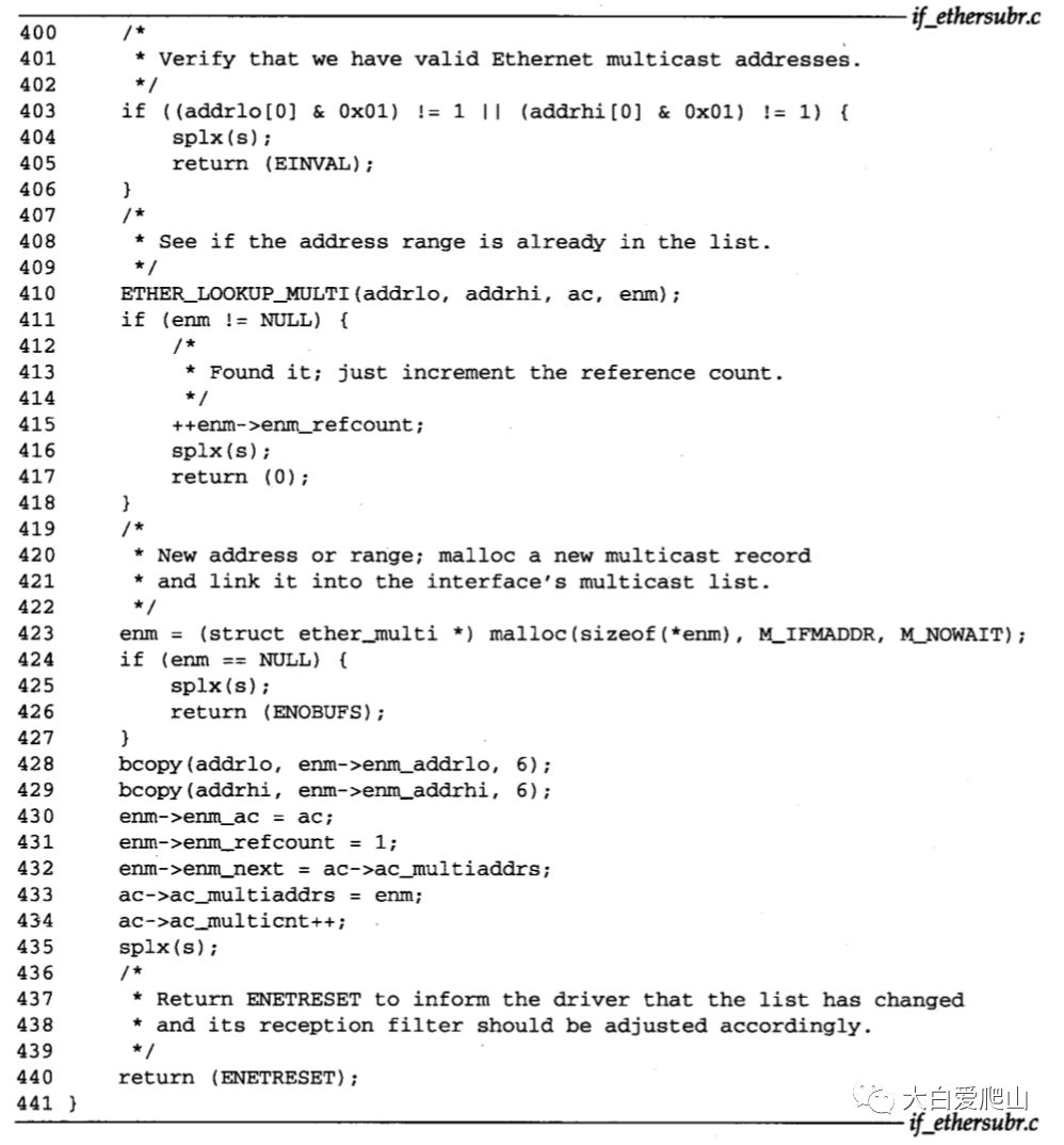 400~418 ether_addmulti检查高地址和低地址是多播比特位,保证它们是真正的以太网多播地址。ETHER_LOOKUP_MULTI确定硬件是否已经对指定的地址开始监听。如果是,则增加匹配的ether_multi结构中的引用计数,并用ether_addmulti返回0.
