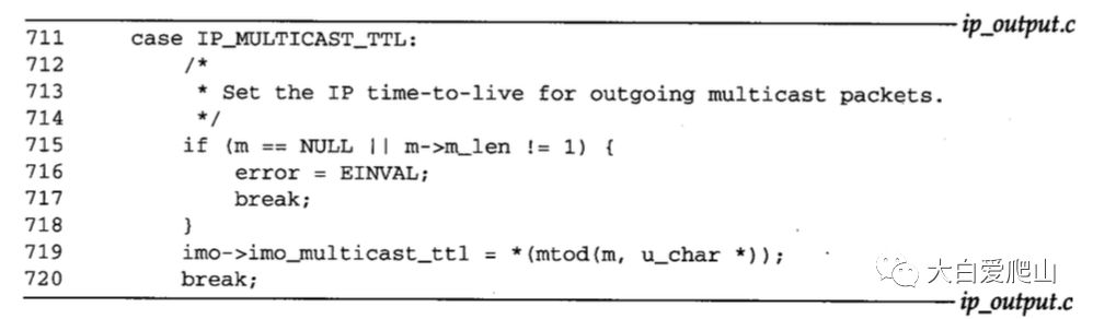 如果传递了一个ip_moptions结构,则相应地改变ip_ttl和ifp。否则,把ip_ttl设置默认值1,避免多播分组到达某个远程网络。查询路由表或者ip_moptions结构所得到的接口必须支持多播。如果不支持,则ip_output丢弃该分组,并返回ENETNUREACH。