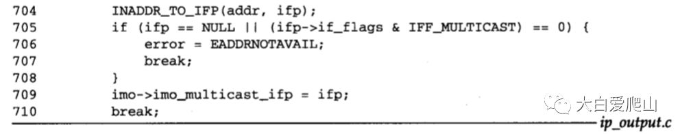 100~106 ip_output通过imo_multicast_ifp指向的接口对输出的多播数据报进行选路。如果imo_multicast_ifp为空,就选择目的站多播组的默认接口。