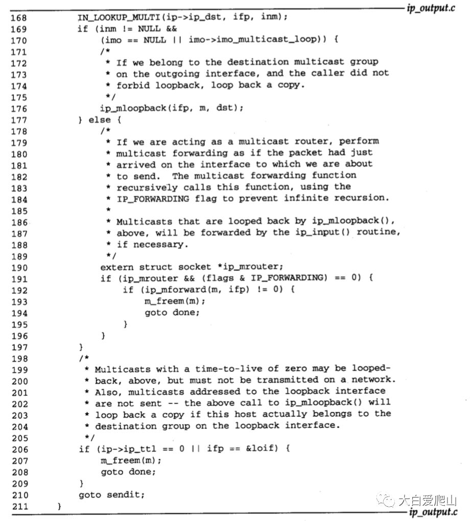 198~209 TTL是0的分组可能被环回,但从不转发它们(ip_mforward丢弃它们),也从不被发送。如果TTL是0或者如果输出接口是环回接口,则ip_output丢弃该分组,因为TTL超时,或者分组已经被ip_mloopback环回了。