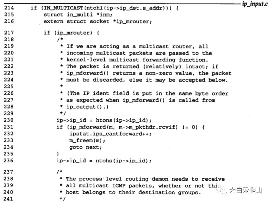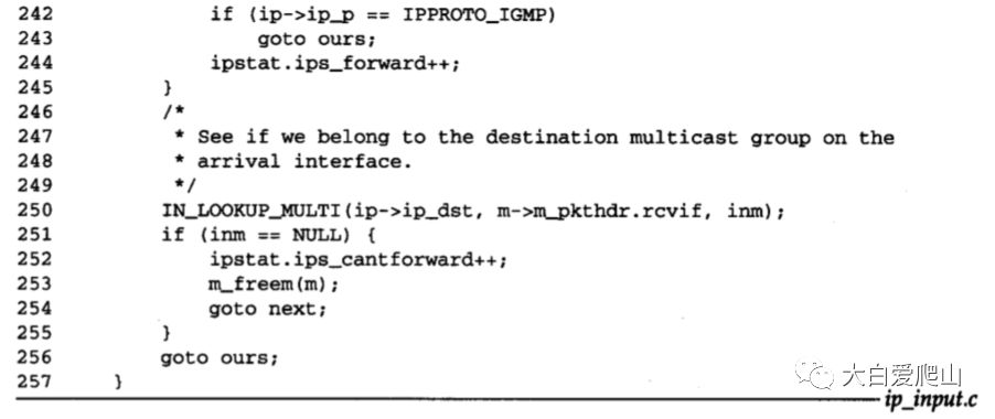 214~245 如果目的地址不是一个IP多播组,则跳过整个这部分代码。如果地址是一个多播组,并且系统被配置成IP多播路由器(ip_mrouter),就把ip_id转换成网络字节序列,并把分组传给ip_mforward。如果出现错误或者分组是通过一个多播隧道到达的,则ip_mforward返回一个非零值。分组被丢弃,且ips_cantforward加1。