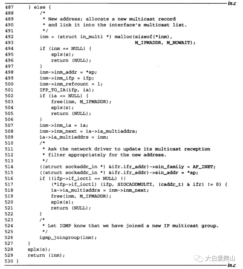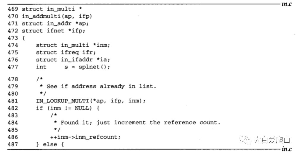 469~487 ip_setmoptions已经证实ap指向一个D类多播地址,ifp指向一个能够多播的接口。IN_LOOKUP_MULTI(图9)确定接口是否已经是该组的一个成员。如果是,则in_addmulti更新引用计数后返回。