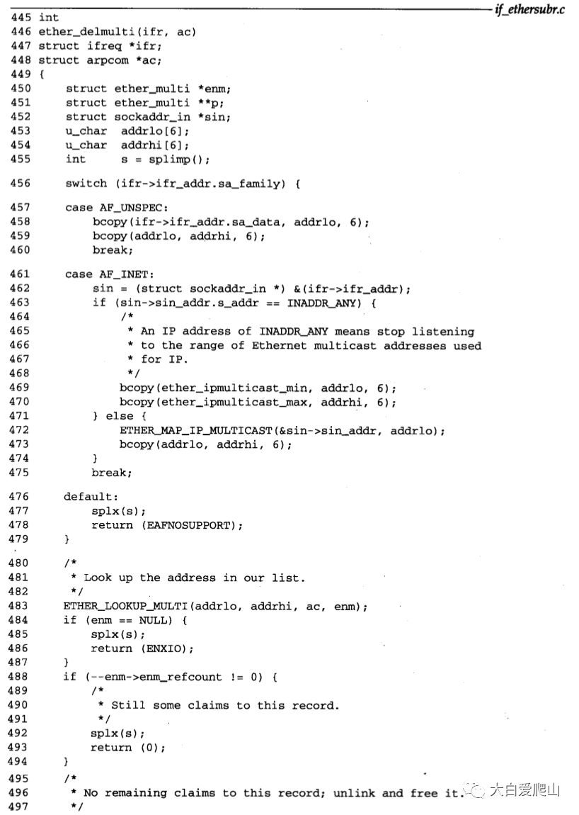 445~479 ether_delmulti函数用ether_addmulti函数采用的同一方法初始化addrlo和addrhi数组。