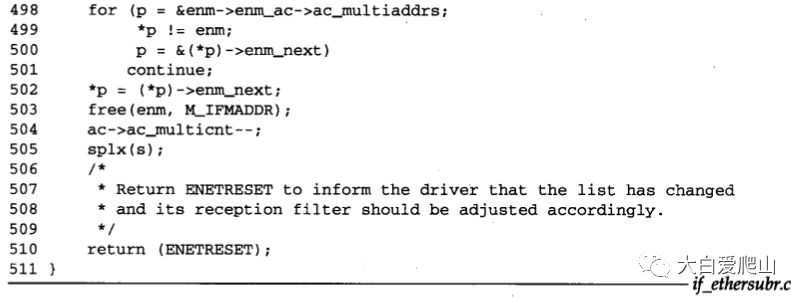 495~511 for循环搜索ether_multi表,寻找匹配的地址范围,并从链表中断开匹配的结构,将它释放。最后更新链表长度,返回ENETRESET,使设备驱动程序可以更新它的硬件接收过滤器