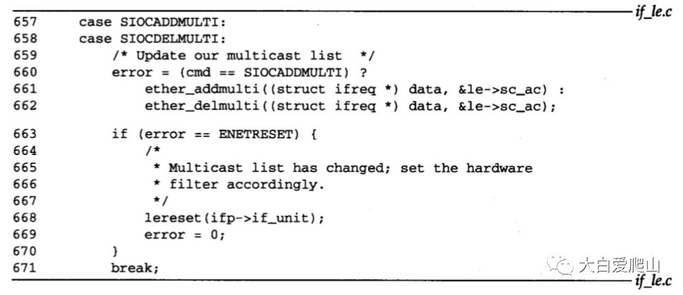 657~671 leioctl把增加和删除请求直接传给ether_addmulti或者ether_delmulti函数。如果请求改变了该物理硬件接收的IP多播地址集,则两个函数都返回ENETRESET。如果发生这种情况,则leioctl调用lereset,用新的多播接收表重新初始化该硬件。