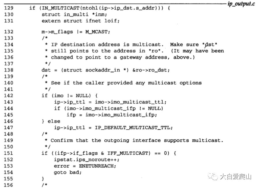 129~155 只有分组是到一个多播组时,才执行图35中的程序。此时,ip_output把mbuf中的M_MCAST置位,并把dst重设成最终目的地址,因为ip_output可能曾把它设成下一跳路由器。