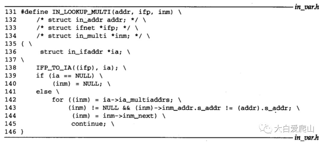 131~146 IN_LOOKUP_MULTI在与接口ifp相关的多播组表中查找多播组addr。IFP_TO_IA搜索Internet地址链表in_ifaddr,寻找与接口ifp相关的in_ifaddr结构。如果IFP_TO_IA找到一个接口,则for循环搜索它的IP多播表。循环结束后,inm为空或者指向匹配的in_multi结构。