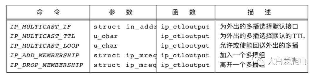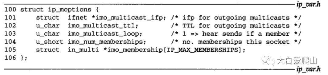 ip_moptions结构是多播输出处理的基础。它控制对输出接口的选择、TTL值以及环回策略。它也控制对in_multi结构的引用计数,从而决定接口加入或者离开某个IP多播组的时机。