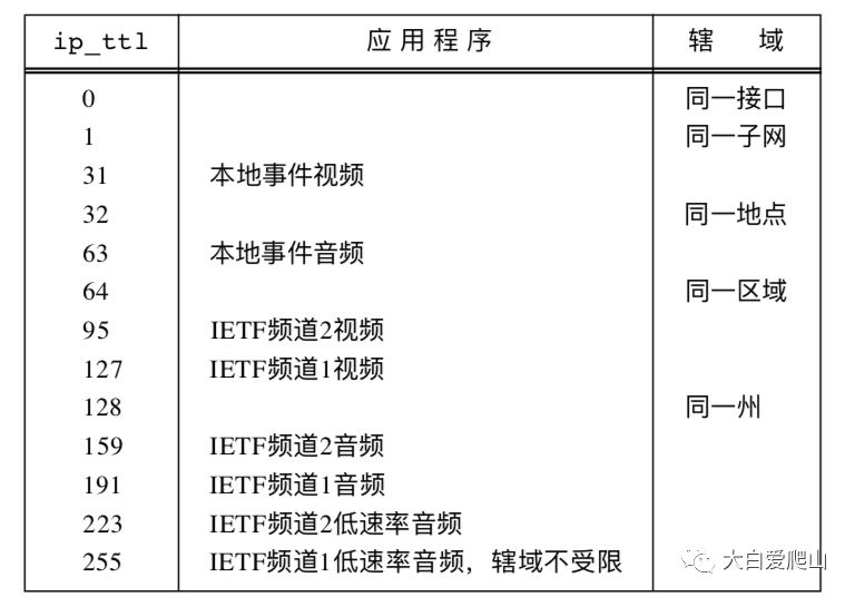 多播TTL值难以理解,因为它们有两个作用。TTL值的基本作用,如IP分组一样,是限制分组在互联网内的生存期,避免它有网络中无限循环。第二个作用是,把分组 限制在管理边界所指定的互联网的某个区域内。管理区域是由一些主机相关的词语指定的,如“这个结点”,“这个公司”,“这个州”等,并与分组开始的地方有关。与多播分组有关的区域叫做它的辖域。