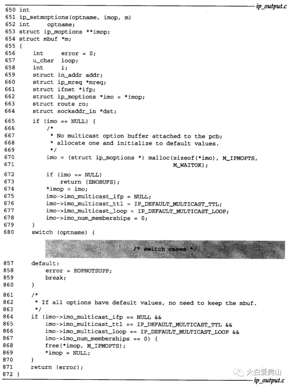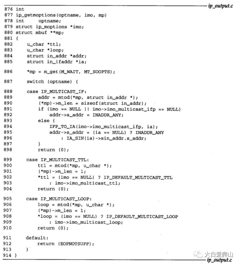 876~914 ip_getmoptions的三个参数:optname,要取得的选项;imo,ip_moptions结构;mp,一个指向mbuf的指针。m_get分配一个mbuf存放该选项数据。这三个选项的指针(分别是addr、ttl和loop)初始化为指向mbuf的数据域,而mbuf的长度被设成选项数据的长度。