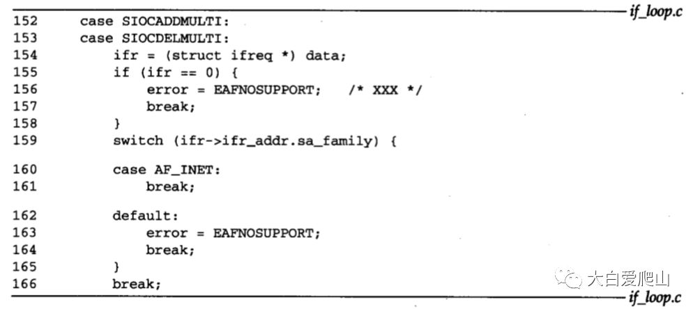 152~166 环回接口的处理和图24中的SLIP的程序一样。不管请求为空还是不适用于AF_INET协议族,都返回EAFNOSUPPORT。