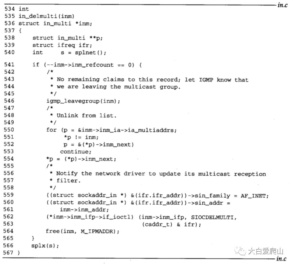 534~567 in_delmulti一开始就减少了in_multi结构的引用计数,如果该计数非零,则返回。如果为零,则表明在指定的{接口,组}对上,没有其它进程等待多播数据报。调用igmp_leavegroup,但该函数不做任何事情。
