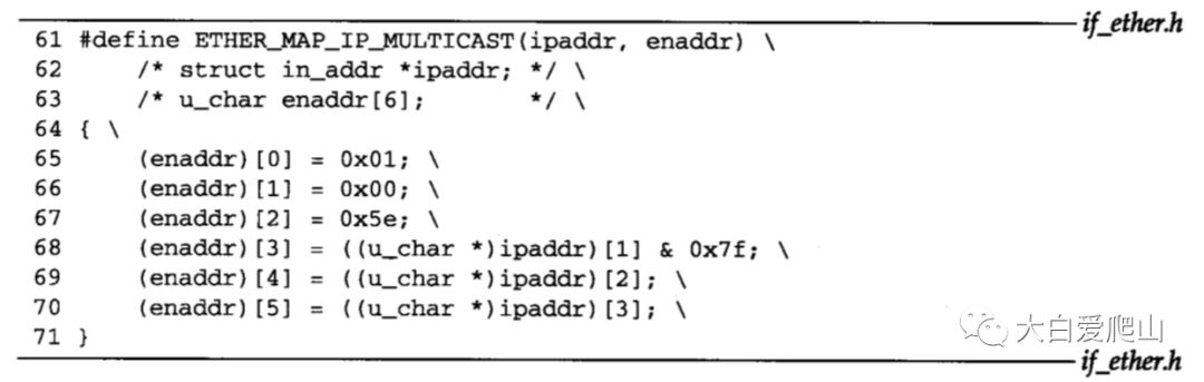 图2显示的映射是一个多到一的映射。在构造以太网地址时,没有使用D类地址的高位9比特。32bit的IP多播组映射到一个以太网多播地址。图3显示了Net/3中实现的这个映射宏。