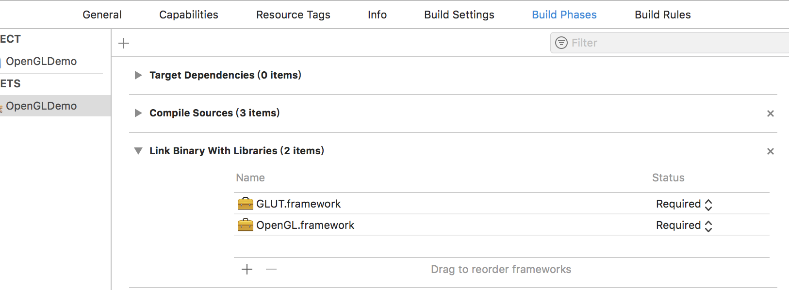 3.Targets-> Build Phases->Link Binary...添加OpenGL GLUT这两个framework