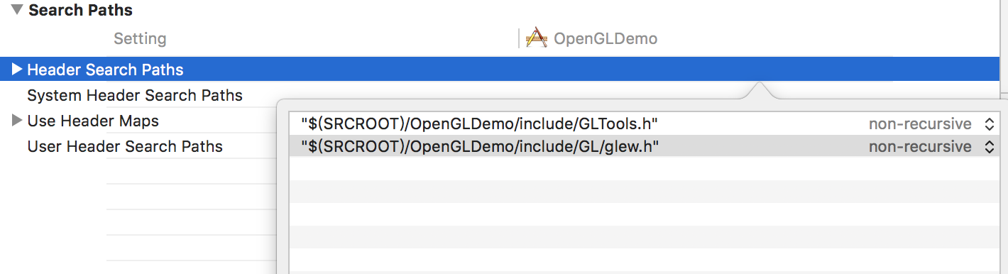 4.Targets-> Build Settings 搜索Header Search Paths 将include下的GLTools glew路径拖进来