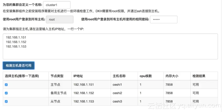 1ã为集群自定义一个名称:在安装集群组建之前安装程序需要对主机进行一些环境检查工作,DKhadoop需要root权限,并通过ssh链接到主机。