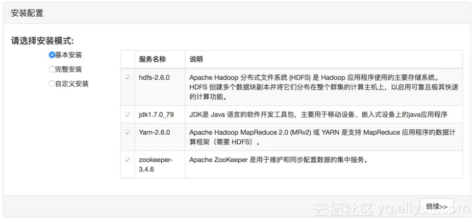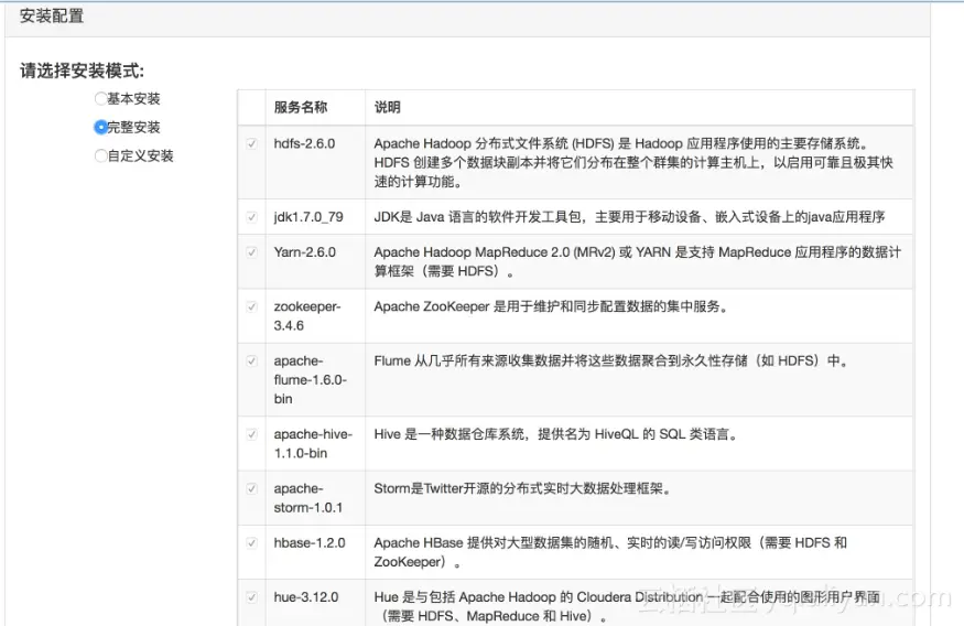 2ã选择安装模式,安装模式有三种可以选择,分别是基础安装、完整安装和自定义安装。基本安装中包含的服务内容有:hafs-2.6.0的安装、JDK1.7.0_79安装、Yarn-2.6.0安装以及zooleeper-3.4.6安装