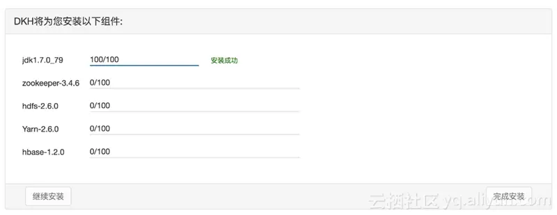 5ã从上述3种安装模式中选择一个合适的模式后,点击右下角的【继续】将自动进行组建的安装,所有组建安装成功后也就完成了集群环境的部署。