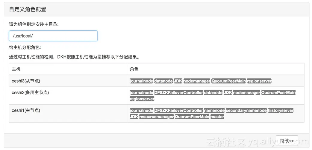 4ã自定义安装模式则可以自主的进行角色配置,通过对主机性能的检测DKhadoop会按照主机性能推荐相应的分配设置。