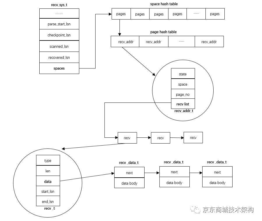 其中Spaces *spaces 是以space_id做hash的hash表,表里面存放的元素是以page_no做hash的hash表(pages), pages表里存放的是按照lsn大小排序的需要在该页上进行恢复的日志记录。