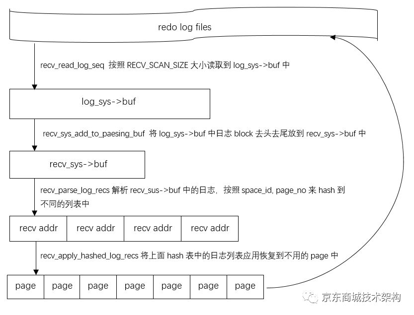 在recv_recovery_begin中,存在一个循环,该循环以checkpoint为起点,调用底层函数(recv_read_log_seg),按照RECV_SCAN_SIZE(64KB)大小分批读取日志数据到log_sys->buf中,然后调用调用recv_scan_log_recs对读取到的数据进行扫描解析和应用,直到所有的日志都处理完毕。